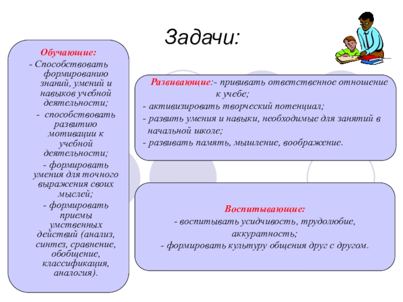 - Способствовать формированию знаний, умений и навыков учебной деятельности;