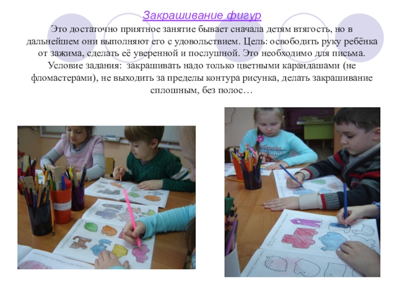 дальнейшем они выполняют его с удовольствием. Цель: освободить руку ребёнка от зажима, сделать её уверенной и послушной. Это необходимо для письма. Условие задания: закрашивать надо только цветными карандашами (не фломастерами), не выходить за пределы контура рисунка, делать закрашивание сплошным, без полос…
