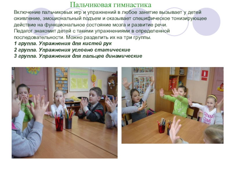 Включение пальчиковых игр и упражнений в любое занятие вызывает у детей оживление, эмоциональный подъем и оказывает специфическое тонизирующее действие на функциональное состояние мозга и развитие речи.
