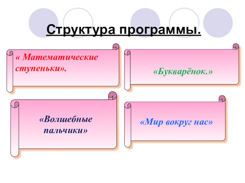 «Букварёнок», «Математические ступеньки», «Волшебные пальчики», «Мир вокруг нас», «Час игры»