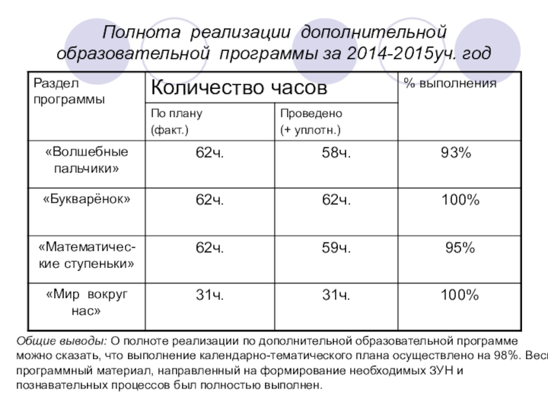 реализации по дополнительной образовательной программе можно сказать, что выполнение календарно-тематического плана осуществлено на 98%. Весь программный материал, направленный на формирование необходимых ЗУН и познавательных процессов был полностью выполнен.