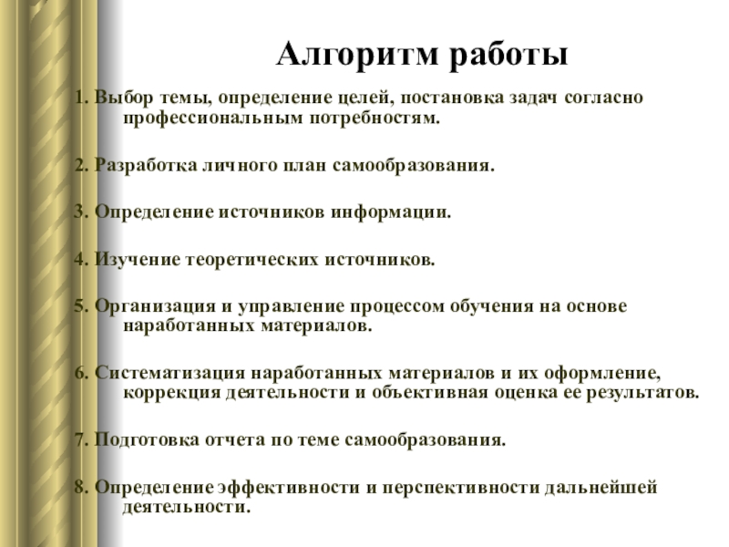 Алгоритм работы1. Выбор темы, определение целей, постановка задач согласно профессиональным потребностям. 2. Разработка личного план самообразования.3. Определение