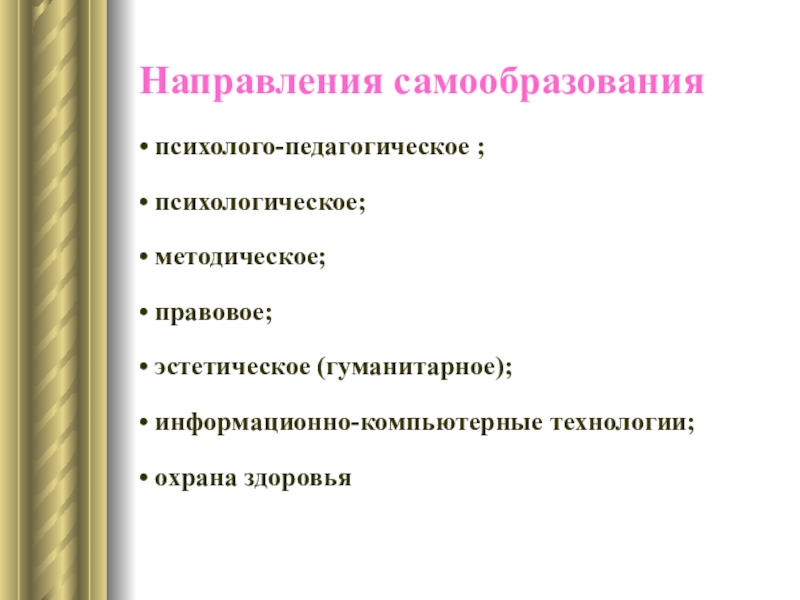 Направления самообразования• психолого-педагогическое ;• психологическое;• методическое;• правовое;• эстетическое (гуманитарное);• информационно-компьютерные технологии;• охрана здоровья