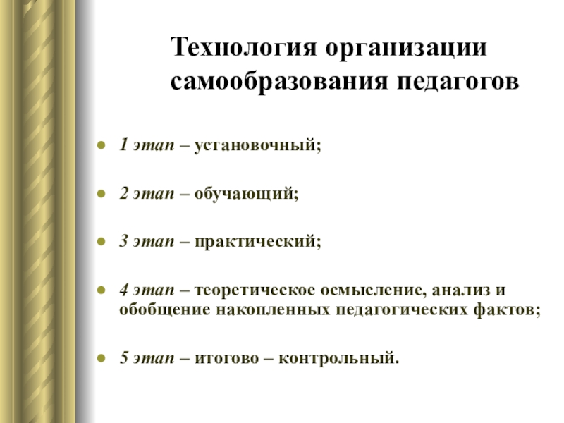 Технология организации самообразования педагогов1 этап – установочный;2 этап – обучающий;3 этап – практический;4 этап – теоретическое осмысление,