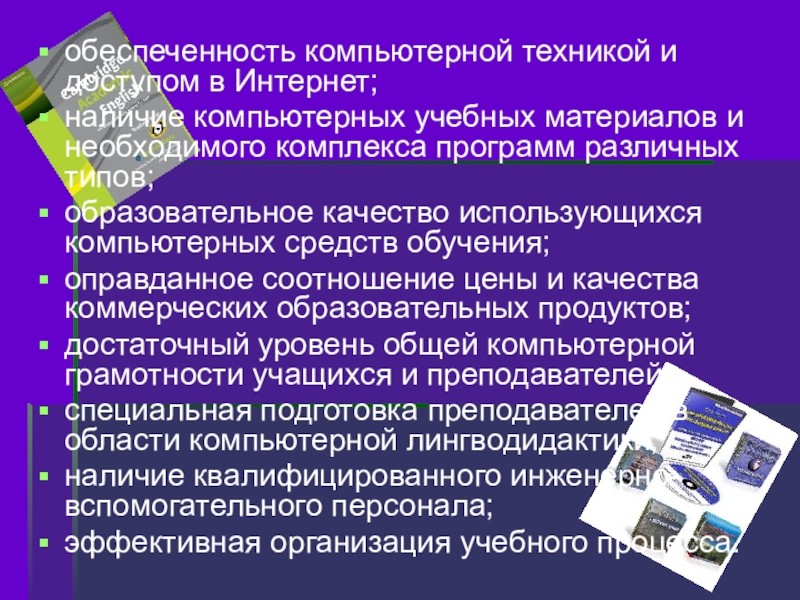 обеспеченность компьютерной техникой и доступом в Интернет; наличие компьютерных учебных материалов и необходимого комплекса программ различных типов;