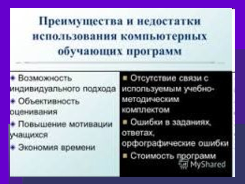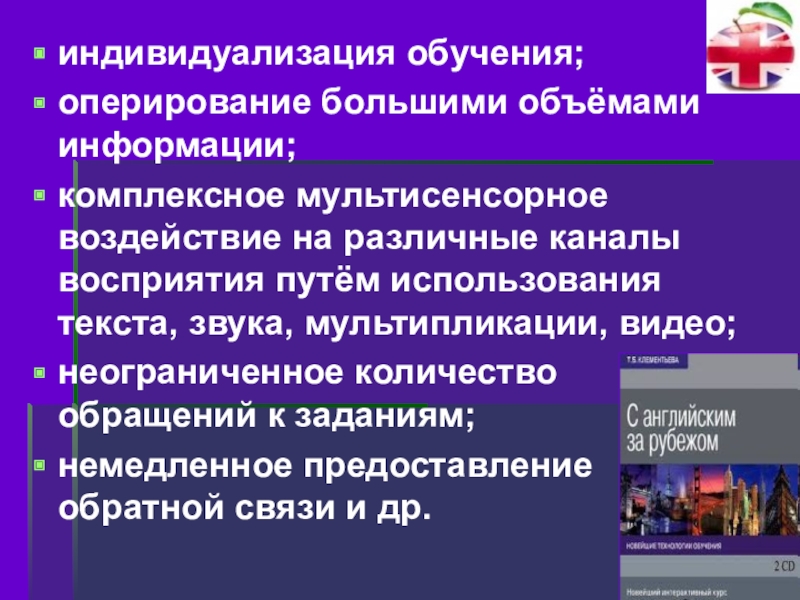 индивидуализация обучения; оперирование большими объёмами информации; комплексное мультисенсорное воздействие на различные каналы восприятия путём использования текста, звука,