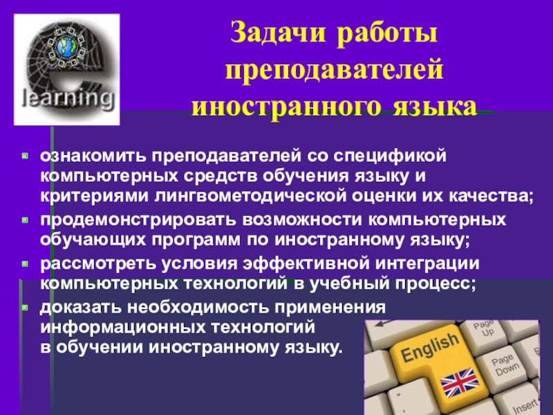 Задачи работы преподавателей  иностранного языка ознакомить преподавателей со спецификой компьютерных средств обучения языку и критериями лингвометодической
