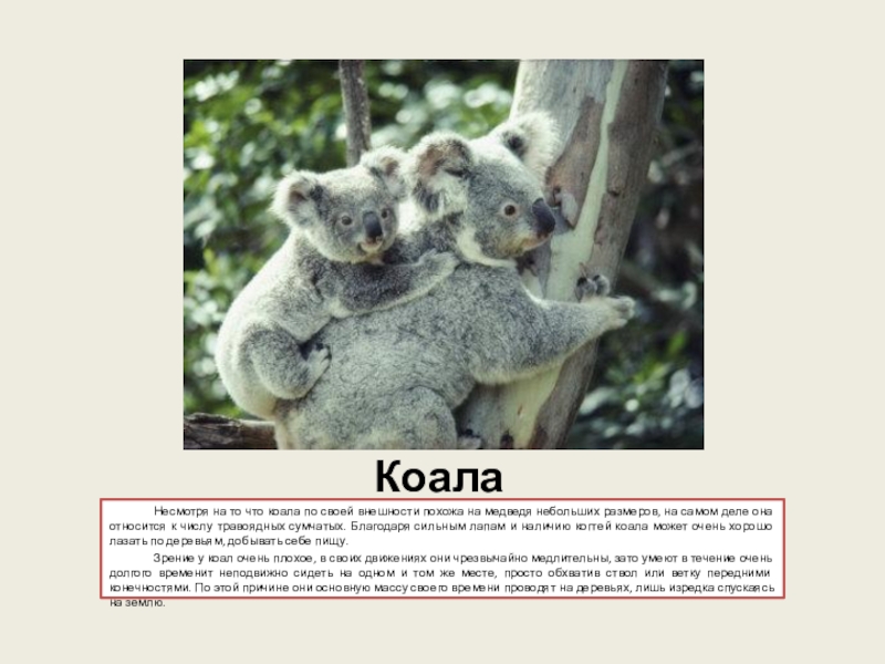 небольших размеров, на самом деле она относится к числу травоядных сумчатых. Благодаря сильным лапам и наличию когтей коала может очень хорошо лазать по деревьям, добывать себе пищу.