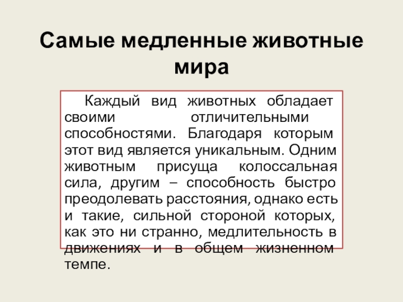 которым этот вид является уникальным. Одним животным присуща колоссальная сила, другим – способность быстро преодолевать расстояния, однако есть и такие, сильной стороной которых, как это ни странно, медлительность в движениях и в общем жизненном темпе.