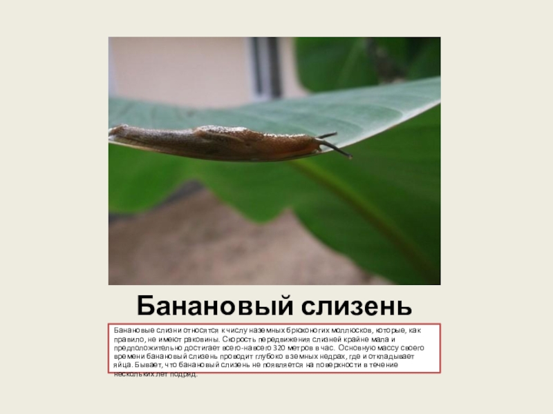 правило, не имеют раковины. Скорость передвижения слизней крайне мала и предположительно достигает всего-навсего 320 метров в час. Основную массу своего времени банановый слизень проводит глубоко в земных недрах, где и откладывает яйца. Бывает, что банановый слизень не появляется на поверхности в течение нескольких лет подряд.