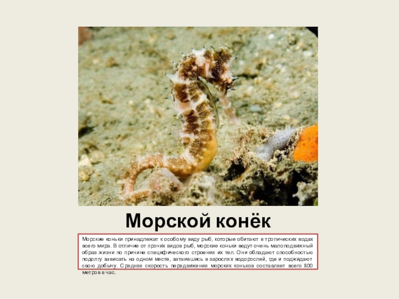 тропических водах всего мира. В отличие от прочих видов рыб, морские коньки ведут очень малоподвижный образ жизни по причине специфического строения их тел. Они обладают способностью подолгу зависать на одном месте, затаившись в зарослях водорослей, где и поджидают свою добычу. Средняя скорость передвижения морских коньков составляет всего 800 метров в час.