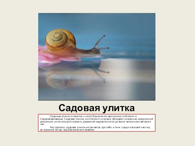 Средиземноморье. Садовая улитка, в отличие от слизней, обладает спирально закрученной раковиной, из-за которой скорость движений садовой улитки до всего нескольких метров в час.
