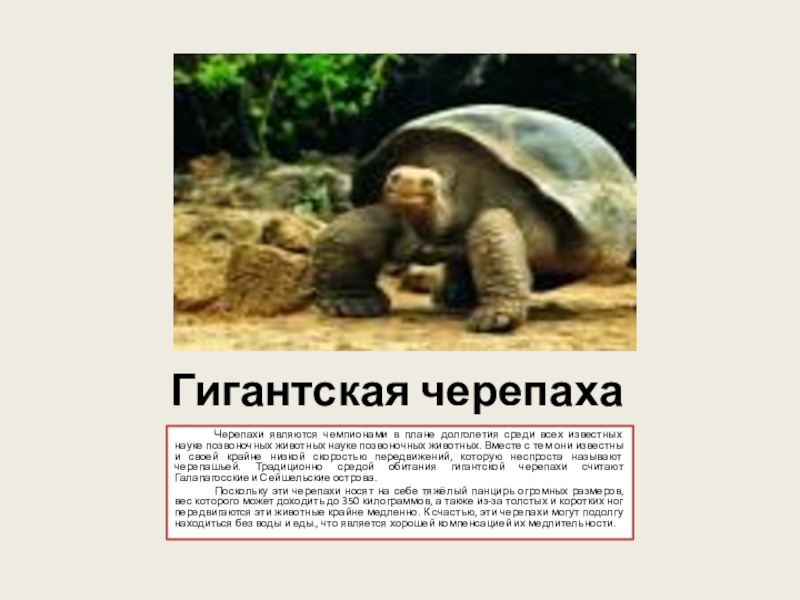 позвоночных животных науке позвоночных животных. Вместе с тем они известны и своей крайне низкой скоростью передвижений, которую неспроста называют черепашьей. Традиционно средой обитания гигантской черепахи считают Галапагосские и Сейшельские острова.