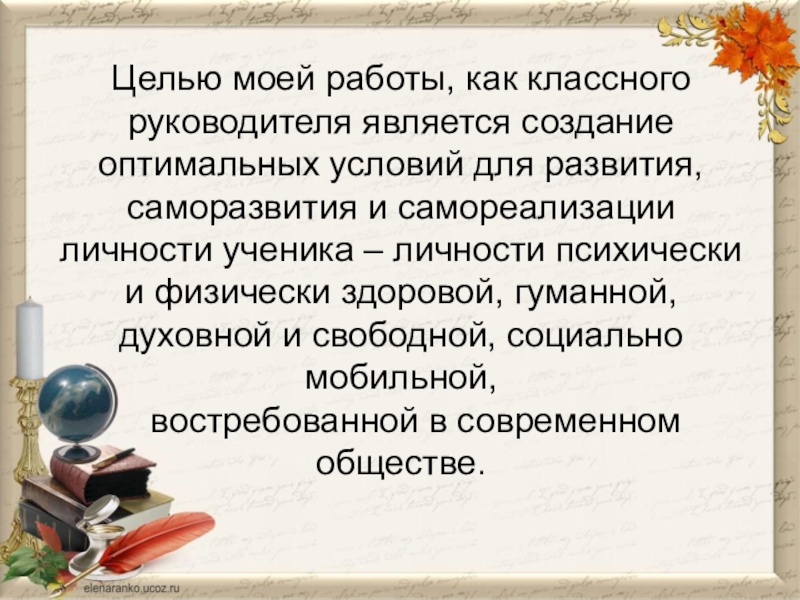 Слайд 5Целью моей работы, как классного руководителя является создание оптимальных условий для