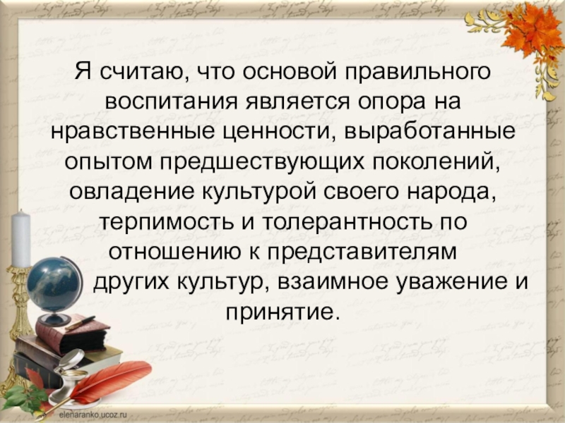 Слайд 6Я считаю, что основой правильного воспитания является опора на нравственные ценности,