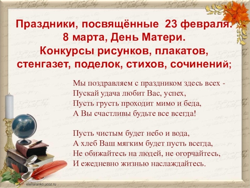 Слайд 13Праздники, посвящённые 23 февраля. 8 марта, День Матери.