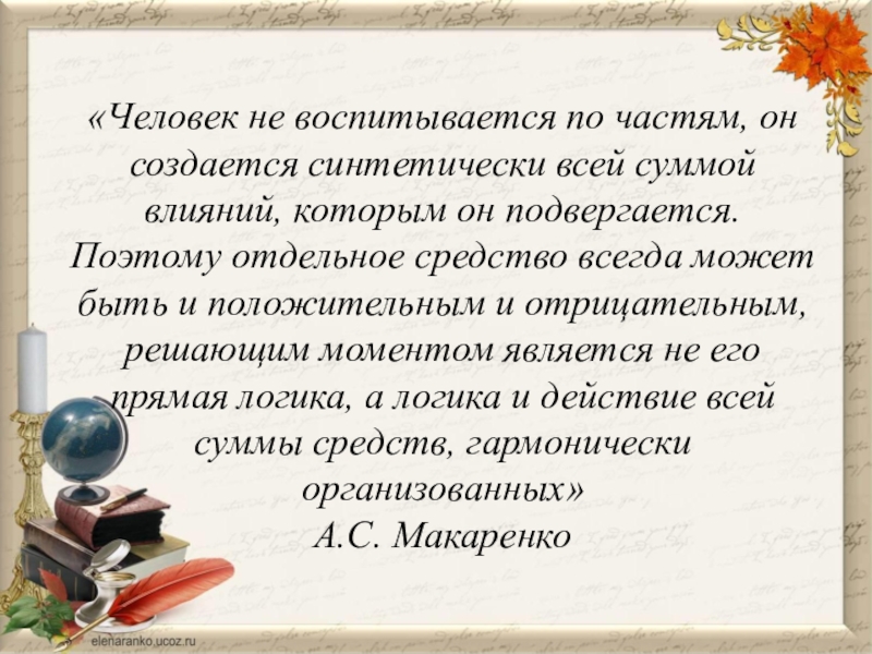 Слайд 3«Человек не воспитывается по частям, он создается синтетически всей суммой влияний,