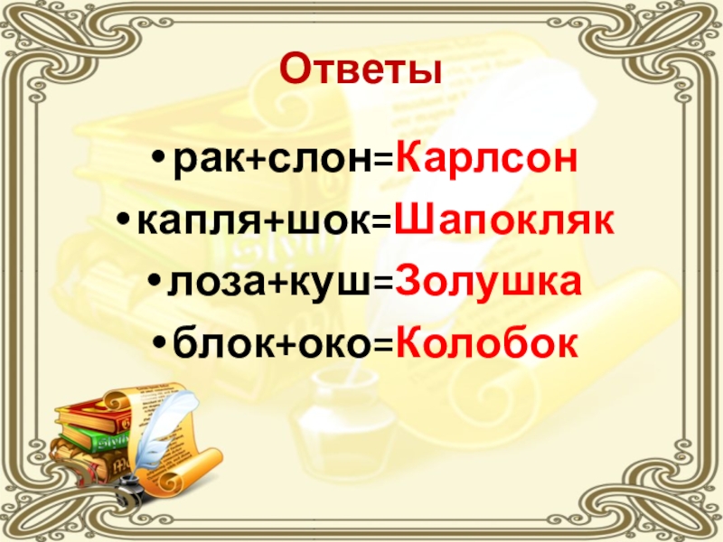 Ответы рак+слон=Карлсон капля+шок=Шапокляклоза+куш=Золушкаблок+око=Колобок