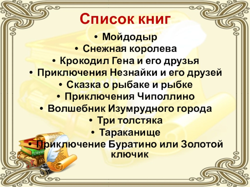Список книгМойдодырСнежная королеваКрокодил Гена и его друзьяПриключения Незнайки и его друзейСказка о рыбаке и рыбкеПриключения ЧиполлиноВолшебник Изумрудного