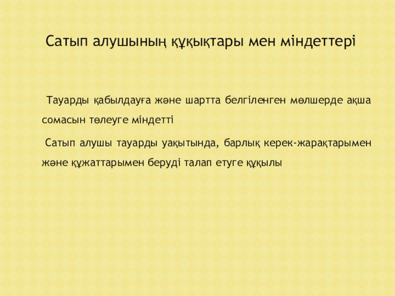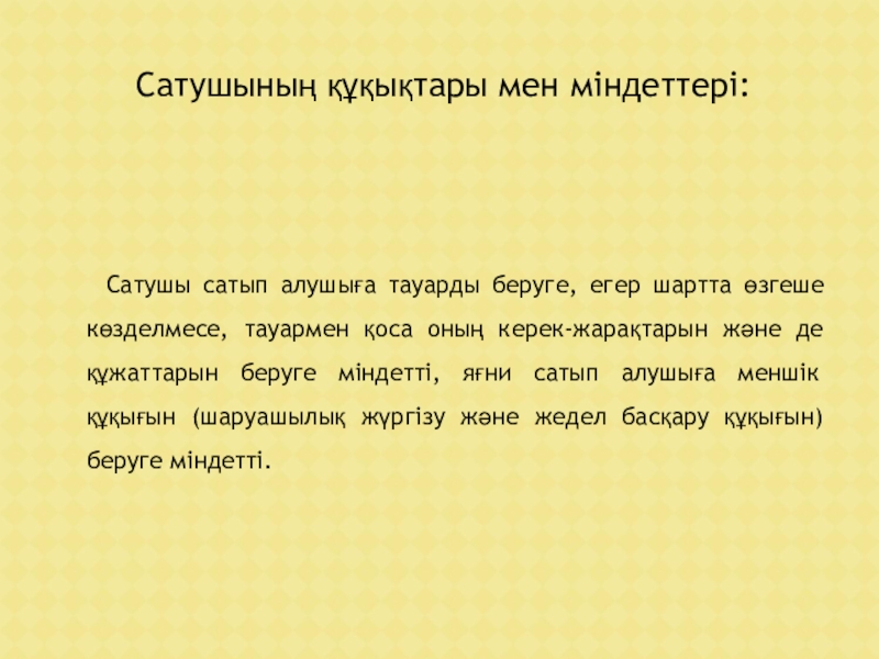 бір тарап (сатушы), мүлікті (тауарды) екінші тараптың (сатып алушының) меншігіне, шаруашылық жүргізуіне, жедел басқаруына беруге міндеттенеді, ал сатып алушы бұл мүлікті (тауарды) қабылдауға және ол үшін белгілі бір ақша сомасын (бағасын) төлеуге міндеттенеді .