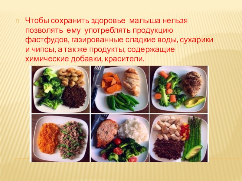 Слайд 8Чтобы сохранить здоровье малыша нельзя позволять ему употреблять продукцию фастфудов, газированные
