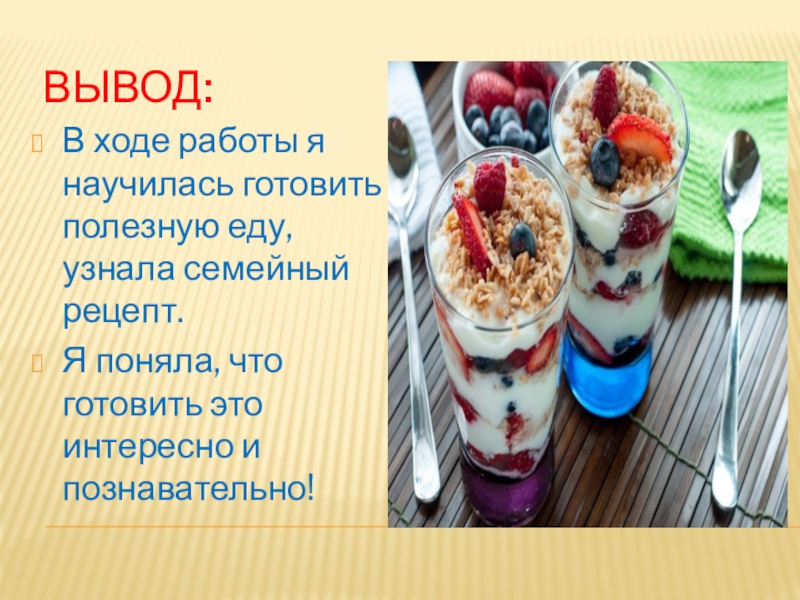 В ходе работы я научилась готовить полезную еду, узнала семейный рецепт.