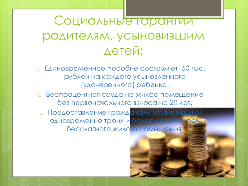 Слайд 10Социальные гарантии родителям, усыновившим детей: