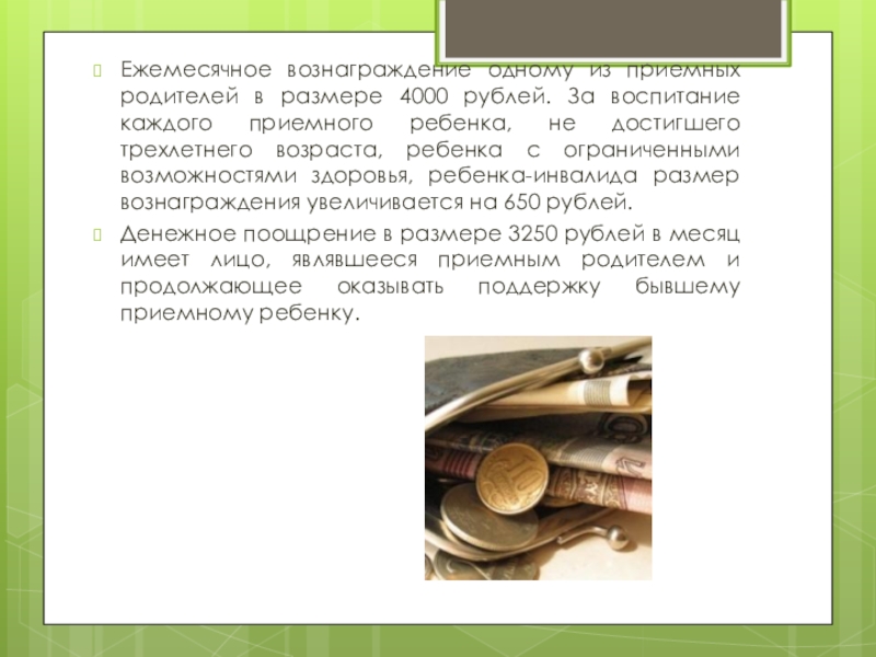 Слайд 20Ежемесячное вознаграждение одному из приемных родителей в размере 4000 рублей. За