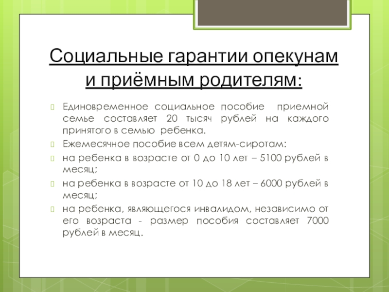 Слайд 19Социальные гарантии опекунам и приёмным родителям: