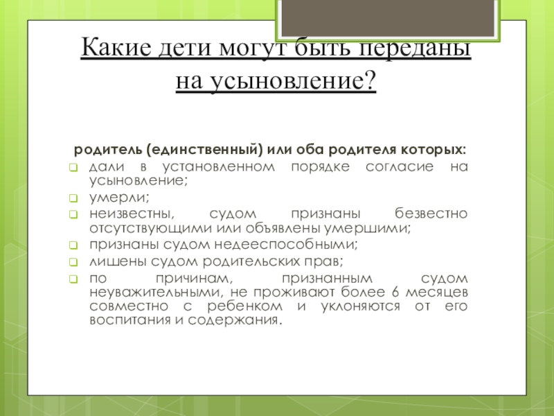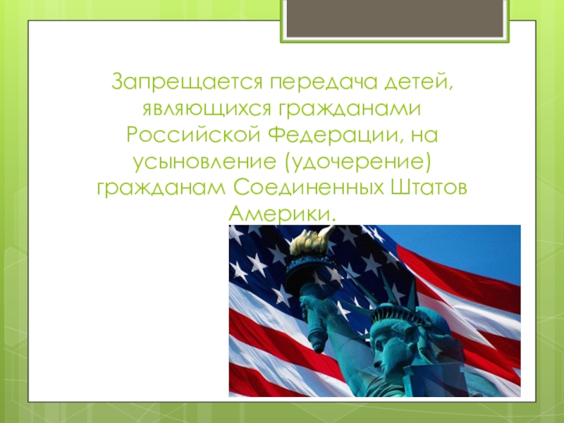 Слайд 8Запрещается передача детей, являющихся гражданами Российской Федерации, на усыновление (удочерение) гражданам