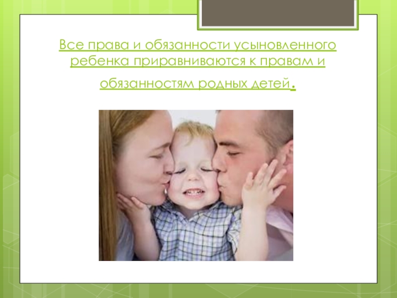 Слайд 6Все права и обязанности усыновленного ребенка приравниваются к правам и обязанностям