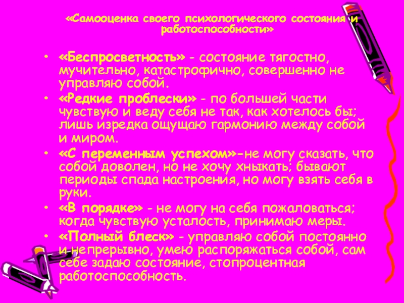 Слайд 4 «Самооценка своего психологического состояния и работоспособности»