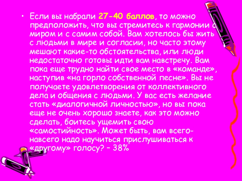Слайд 10Если вы набрали 27-40 баллов, то можно предположить, что вы стремитесь