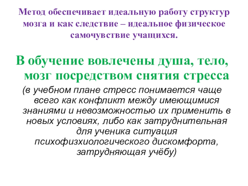 В обучение вовлечены душа, тело, мозг посредством снятия стресса