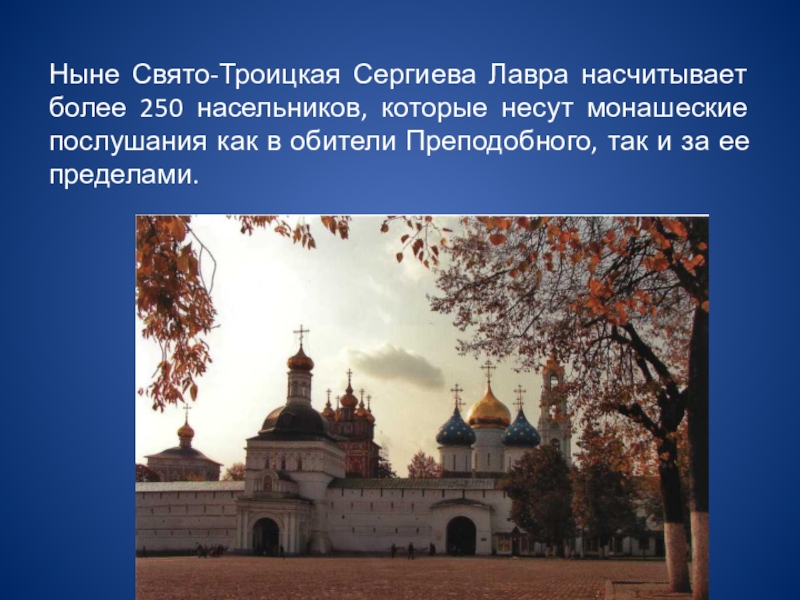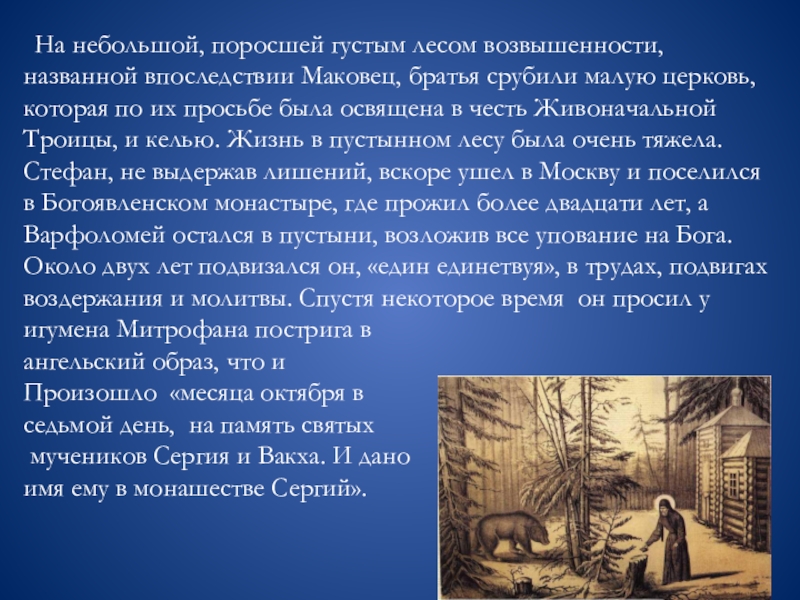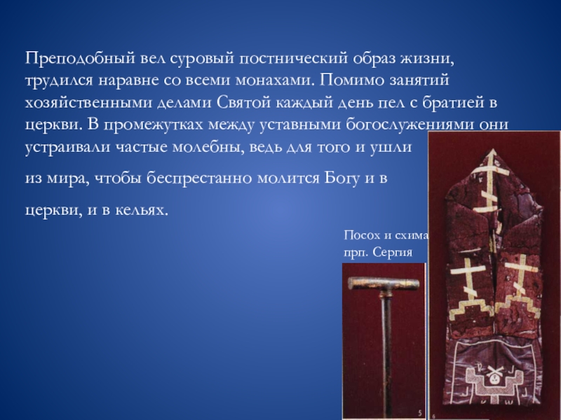 Постепенно вырос небольшой поселок, где каждый отшельник жил в своей собственной келье, а вместе они собирались только к богослужению. Сергий был совершенным работником - умел делать все, без устали: работал за двоих, не стыдился ни поварства, ни плотничества, шил и кроил одежду на братию, катал свечи, варил кутью, копал огород, обмывал умерших...