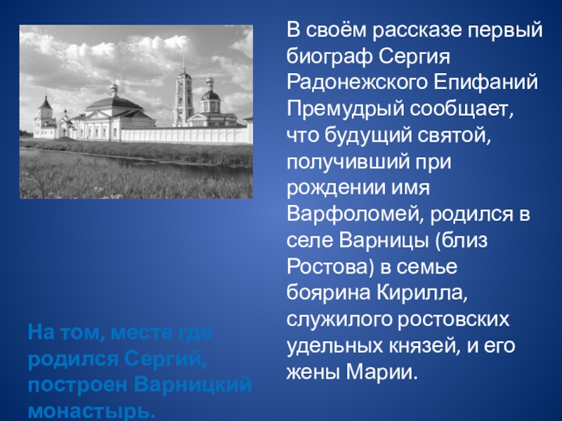 На том, месте где родился Сергий, построен Варницкий монастырь.