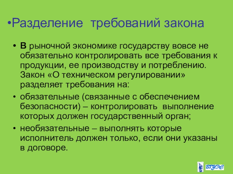 требования к продукции, ее производству и потреблению. Закон «О техническом регулировании» разделяет требования на:
