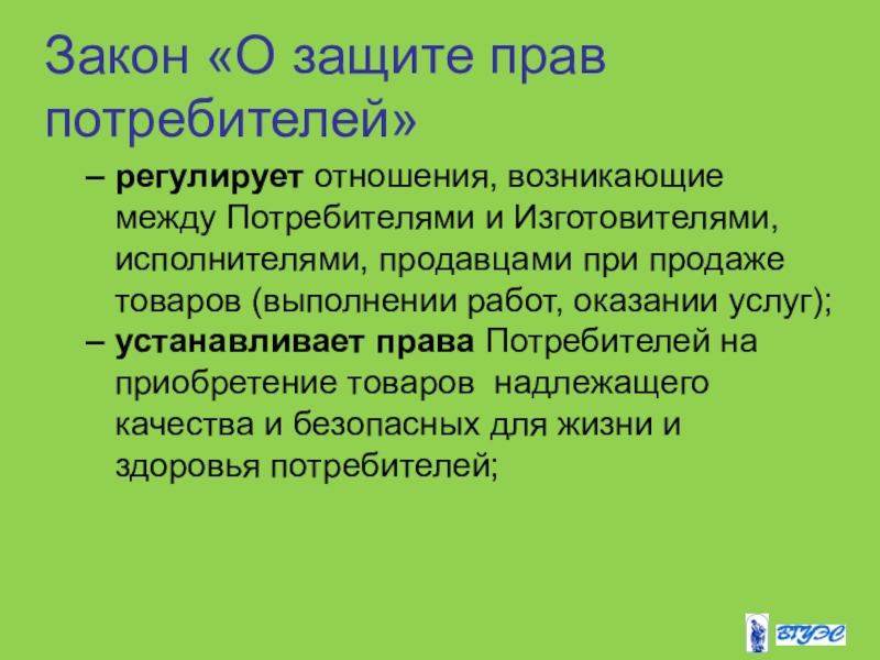 устанавливает права Потребителей на приобретение товаров надлежащего качества и безопасных для жизни и здоровья потребителей;