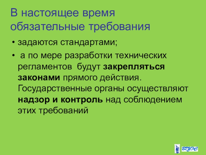 разработки технических регламентов будут закрепляться законами прямого действия. Государственные органы осуществляют надзор и контроль над соблюдением этих требований