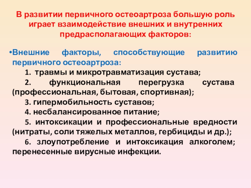 Первичный деформирующий остеоартроз развивается в здоровом до этого хряще под влиянием его чрезмерной нагрузки. Причины первичного остеоартроза окончательно не известны.