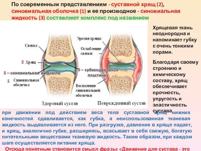 при движении под действием веса тела суставной хрящ нижних конечностей сдавливается, как губка, а неиспользованная тканевая жидкость выдавливается из него. При разгрузке, давление в хряще падает, и хрящ, аналогично губке, расширяясь, всасывает в себя свежую, богатую питательными веществами тканевую жидкость. Таким образом, при каждом шаге осуществляется питание хряща.