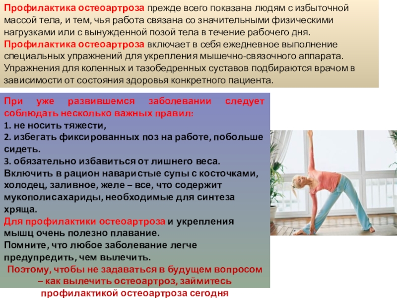 Профилактика остеоартроза прежде всего показана людям с избыточной массой тела, и тем, чья работа связана со значительными физическими нагрузками или с вынужденной позой тела в течение рабочего дня.