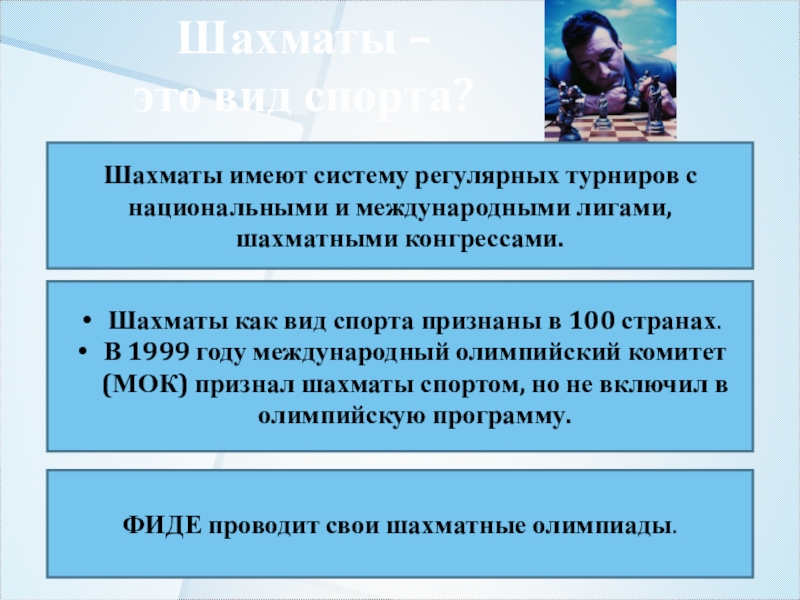 В 1999 году международный олимпийский комитет (МОК) признал шахматы спортом, но не включил в олимпийскую программу.