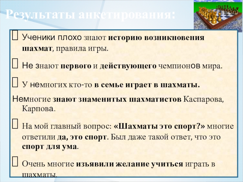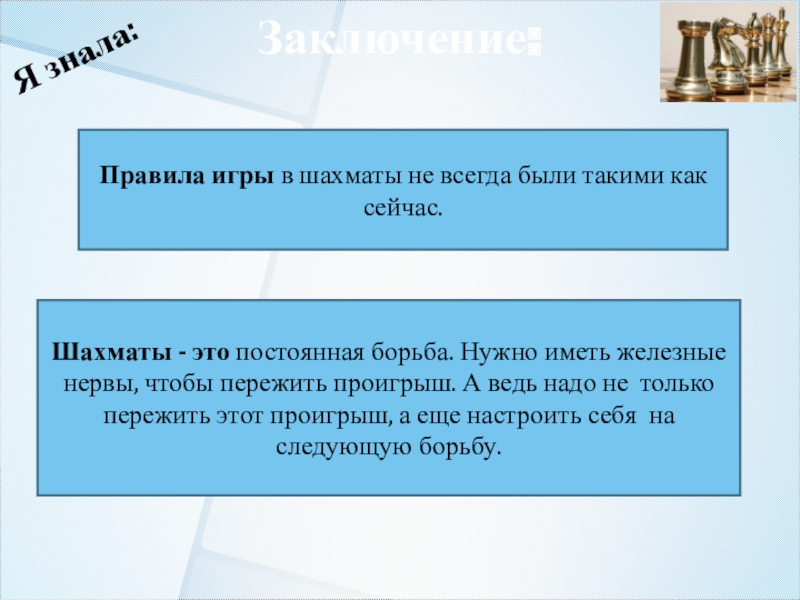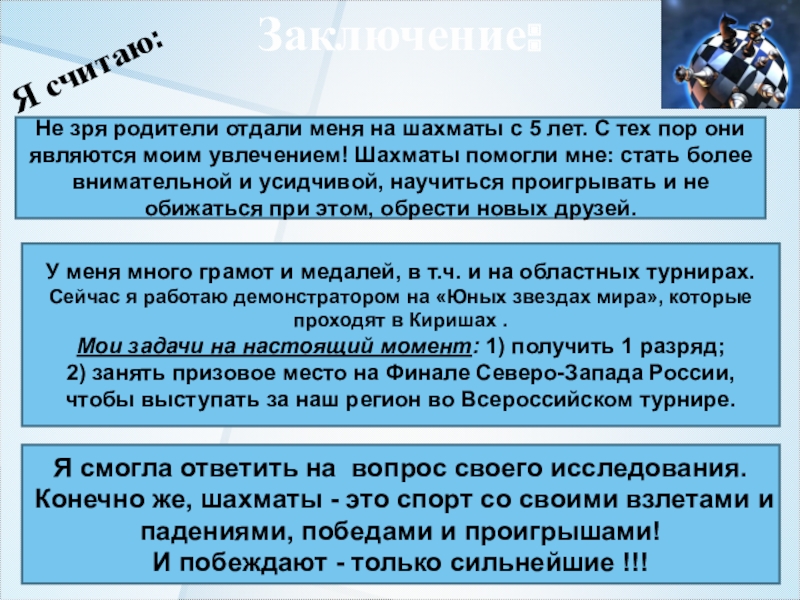 Я смогла ответить на вопрос своего исследования. Конечно же, шахматы - это спорт со своими взлетами и падениями, победами и проигрышами!