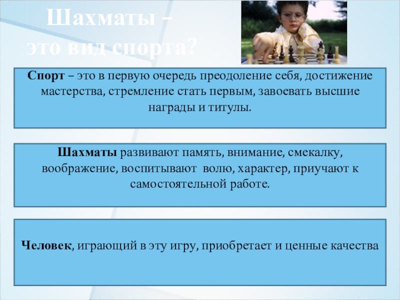 Шахматы развивают память, внимание, смекалку, воображение, воспитывают волю, характер, приучают к самостоятельной работе.