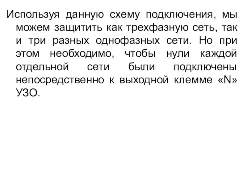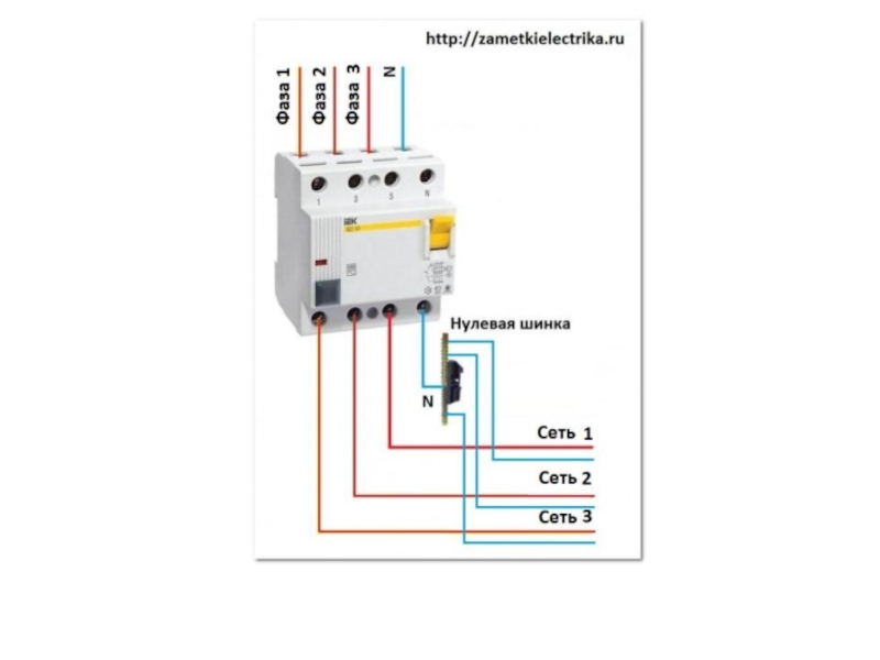 и три разных однофазных сети. Но при этом необходимо, чтобы нули каждой отдельной сети были подключены непосредственно к выходной клемме «N» УЗО.