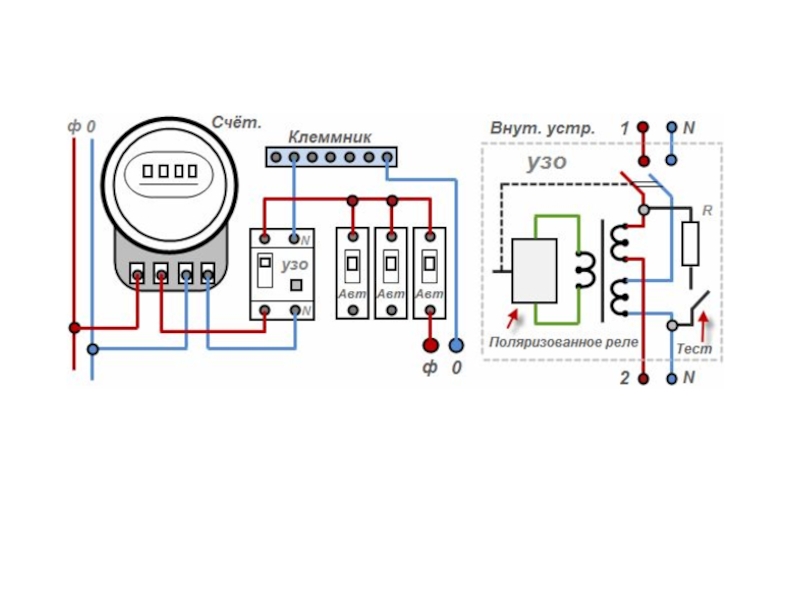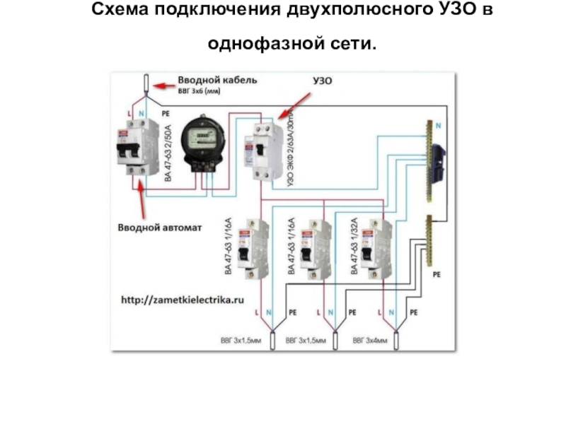 Слайд 2Схема подключения двухполюсного УЗО в однофазной сети.