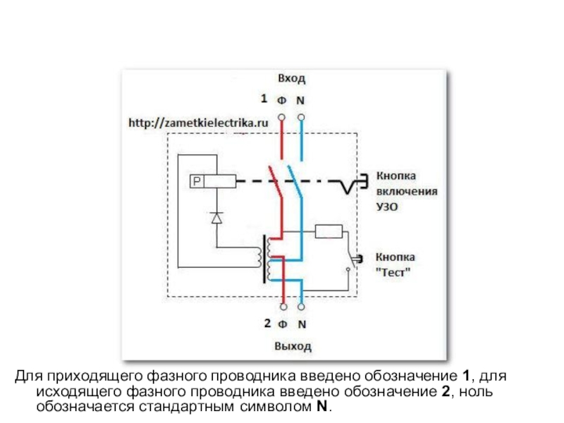 Для приходящего фазного проводника введено обозначение 1, для исходящего фазного проводника введено обозначение 2, ноль обозначается стандартным символом N.