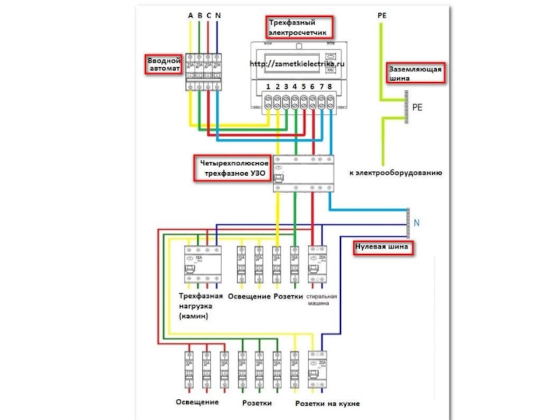 Схема подключения четырехполюсного УЗО в трехфазную сеть с использованием нейтрали.