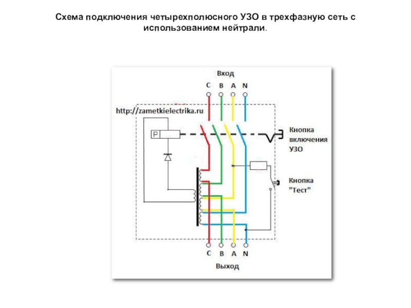 Слайд 5Схема подключения четырехполюсного УЗО в трехфазную сеть с использованием нейтрали.